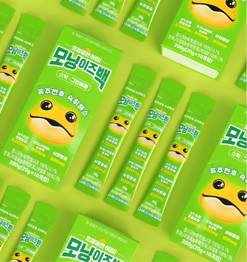 브랜드퍼블리싱 2025 I 모닝이즈백 스틱 그린애플 젤리형태제품 100년 전통의 주류전문가 하이트진로와 협업하여 개발한 숙취해소 전문 브랜드 상큼한 그린애플 맛과 빠른 효과로 숙취해소 시험성적 인증된 젤리스틱 제품 Work Flow : 기획, R&D, 원료수급, 패키지디자인검수, 제조관리