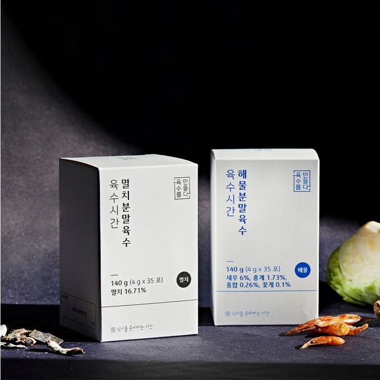 브랜드퍼블리싱 2023 I 육수시간 멸치, 해물 분말 타정형태제품 멸치, 다시마, 대파, 마늘, 황태 다섯 가지 기본 재료는 동결건조 + 저온 공법으로 만들어 재료의 깊은 맛을 끌어냈습니다. Work Flow : 기획, R&D, 원료수급, 패키지디자인, 패키지디자인 검수, 제조관리, 3PL, 마케팅, 판매